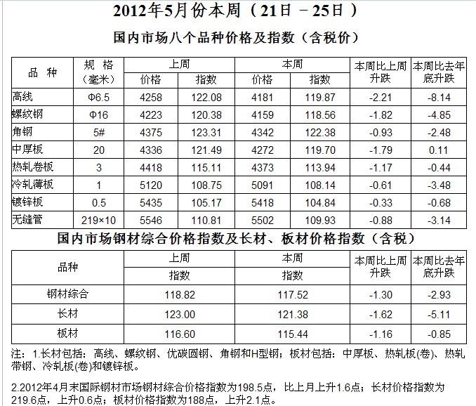 2012年5月本周(21日-25日)國內(nèi)市場八個(gè)品種價(jià)格及指數(shù)(含稅價(jià)) |