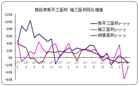下圖為我國(guó)商品房新開(kāi)工面積、施工面積以及銷售面積同比增速走勢(shì)圖,從圖上可以看出,4月份我國(guó)商品房同比增速均繼續(xù)呈現(xiàn)負(fù)值。繼國(guó)內(nèi)一線城市以及省會(huì)城市實(shí)施限購(gòu)政策以來(lái),商品房投資可謂一路下滑。不僅對(duì)國(guó)內(nèi)消費(fèi)影響較大,同時(shí)也導(dǎo)致開(kāi)發(fā)商對(duì)終端鋼材的需求量出現(xiàn)了明顯的回落。尤其是2012年前四個(gè)月,銷售面積同比增速一直下滑,并且新開(kāi)工面積和施工面積也徘徊在零增速附近。
