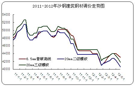 以下是河鋼和沙鋼兩大鋼廠2011年-2012年建筑鋼材政策調(diào)整走勢(shì)圖。由于本月國(guó)內(nèi)主要市場(chǎng)建筑鋼材現(xiàn)貨價(jià)格下滑幅度較大,一線鋼廠雖略有滯后,但整體上均以降價(jià)為主,并且降幅要小于現(xiàn)貨市場(chǎng),也就是說(shuō),在鋼廠價(jià)格調(diào)整之后,主導(dǎo)市場(chǎng)價(jià)格仍然倒掛,貿(mào)易商也仍處于虧損狀態(tài)。尤其是河北鋼鐵集團(tuán),在北方市場(chǎng)整體出貨情況不樂(lè)觀的情況下,鋼廠甚至出臺(tái)相關(guān)政策,限制代理商降價(jià)幅度,以保證其訂貨價(jià)格。但是這樣一來(lái),河鋼與其他鋼廠資源價(jià)差逐步增大,不但對(duì)于其自身出貨不利,反而增大了貿(mào)易商的虧損幅度以及市場(chǎng)資源量的消化,因此在這種情況下,中間商也只能以暗降為主。另外由于國(guó)內(nèi)整體資源去庫(kù)存進(jìn)度較慢,以及后期市場(chǎng)風(fēng)險(xiǎn)猶存,多數(shù)大廠代理商訂貨情況均不好。
