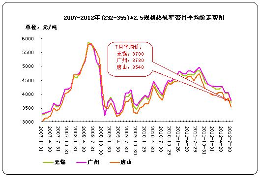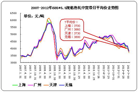 據(jù)中華商務(wù)網(wǎng)監(jiān)測數(shù)據(jù)顯示,2012年7月我國11個主要市場熱軋中寬帶月平均價格3772元/噸,與上月相比跌330元/噸。其中天津、無錫、上海、廣州四個主要市場7月平均價格分別為3730元/噸、3800元/噸、3700元/噸、3860元/噸,分別較上個月跌270元/噸, 380元/噸, 410元/噸和260元/噸。從窄帶和寬帶的跌幅來看,寬帶受熱卷沖擊較大,下跌幅度更多一些,且受電子盤影響較大的上海及無錫華東地區(qū)寬帶下調(diào)更明顯一些。