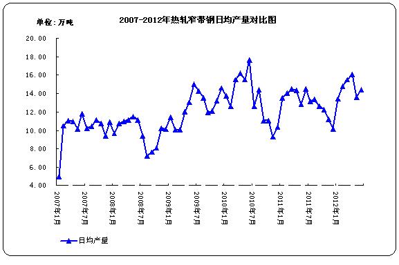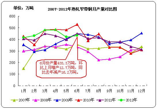 據(jù)中華商務(wù)網(wǎng)監(jiān)測數(shù)據(jù)顯示, 2012年6月份國內(nèi)熱軋窄帶鋼產(chǎn)量433.3萬噸,環(huán)比增產(chǎn)12.7萬噸,日均產(chǎn)量14.44萬噸,日均環(huán)比增長6.41%;比去年同期產(chǎn)量449.5萬噸減產(chǎn)16.2萬噸,同比減少3.6%。2012年6月我國冷軋窄帶產(chǎn)量88.5萬噸,環(huán)比增產(chǎn)8.2萬噸,日均產(chǎn)量2.95萬噸,日均環(huán)比增長13.9%;比去年同期產(chǎn)量92.1萬噸減產(chǎn)3.6萬噸,同比減少3.91%。