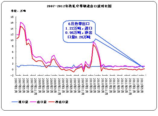 據(jù)中華商務(wù)網(wǎng)監(jiān)測數(shù)據(jù)顯示, 2012年6月份進口熱軋窄帶鋼0.96萬噸,出口1.22萬噸,凈進口0.26萬噸。6月份新增資源量433.04萬噸。