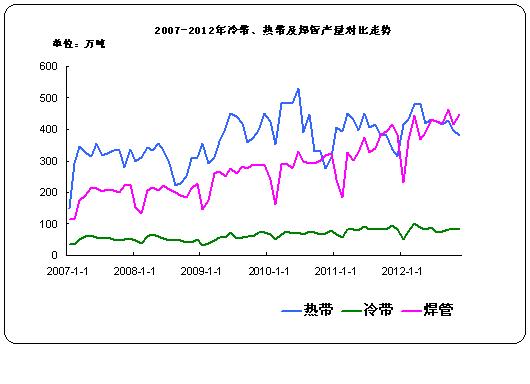 3  07-12年冷帶、熱帶及焊管產(chǎn)量走勢對比圖