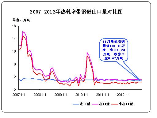 據(jù)中華商務(wù)網(wǎng)監(jiān)測數(shù)據(jù)顯示, 2012年11月份進(jìn)口熱軋窄帶鋼0.76萬噸,出口1.23噸,凈出口0.47萬噸。11月份新增資源量377.93萬噸。1-11月份國內(nèi)熱軋窄鋼帶累計進(jìn)口9.94萬噸,累計出口12.03萬噸。1-11月份新增資源量累計4700.91萬噸。熱軋帶鋼進(jìn)出口量較少,對鋼市的影響極小。