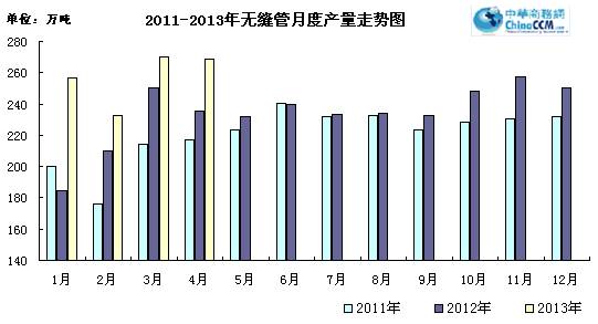 4月份國內(nèi)無縫管產(chǎn)量268.7萬噸,比去年同期多生產(chǎn)28.8萬噸,同比增長12%。環(huán)比3月份減產(chǎn)1.1萬噸,環(huán)比下降0.4%。2013年1-4國內(nèi)無縫管累計產(chǎn)量976萬噸,同比增長9.7%。