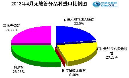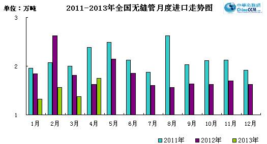 2013年4月份進口無縫管1.75萬噸,比去年同期多進口0.13萬噸,同比增長8.02%。4月份進口環(huán)比上月增加0.37萬噸,環(huán)比增長26.8%。2013年1-4累計進口無縫管6.18萬噸,同比下降21.69%。
