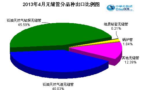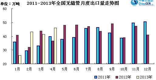 2013年4份出口無縫管45.93萬噸,比去年同期多出口9.24萬噸,同比增長25.18%。4月份出口環(huán)比3月份增加4.4萬噸,環(huán)比增長10.59%。2013年1-4月份累計出口無縫管174.93萬噸,同比增長14.09%。