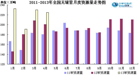4月份國內(nèi)無縫管新增資源量224.52萬噸,比去年同期增加24.09萬噸,同比增長12.02%。環(huán)比3月份減少5.13萬噸,環(huán)比下降2.23%。2013年1-4月份無縫管累計新增資源量859.17萬噸,同比增長16.98%。