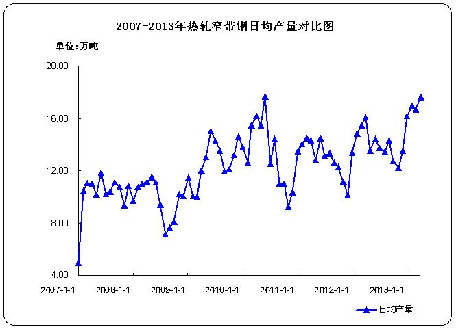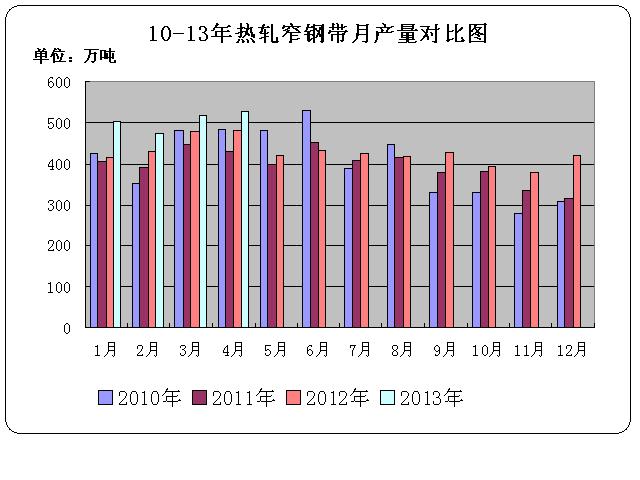 據(jù)中華商務(wù)網(wǎng)監(jiān)測(cè)數(shù)據(jù)顯示,2013年4月份國(guó)內(nèi)熱軋窄帶鋼產(chǎn)量529萬(wàn)噸,環(huán)比增產(chǎn)11.8萬(wàn)噸,環(huán)比增長(zhǎng)2.28%;日均產(chǎn)量17.63萬(wàn)噸,日均環(huán)比增長(zhǎng)5.70%;比去年同期產(chǎn)量481.8萬(wàn)噸增產(chǎn)47.2萬(wàn)噸,同比增長(zhǎng)9.80%。2013年4月份國(guó)內(nèi)冷軋窄帶鋼產(chǎn)量93.9萬(wàn)噸,環(huán)比減產(chǎn)1.7萬(wàn)噸。