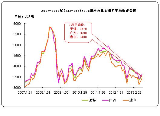 據(jù)中華商務(wù)網(wǎng)監(jiān)測(cè)數(shù)據(jù)顯示,2013年7月,我國(guó)9個(gè)主要市場(chǎng) (232-355) *2.5mm熱軋窄帶月平均價(jià)格為3543元/噸,環(huán)比漲143元/噸,其中唐山、無(wú)錫、廣州三個(gè)主要市場(chǎng)7月份平均價(jià)格為3430元/噸、3570元/噸、3630元/噸,分別比上個(gè)月漲160元/噸,漲130元/噸,漲140元/噸。