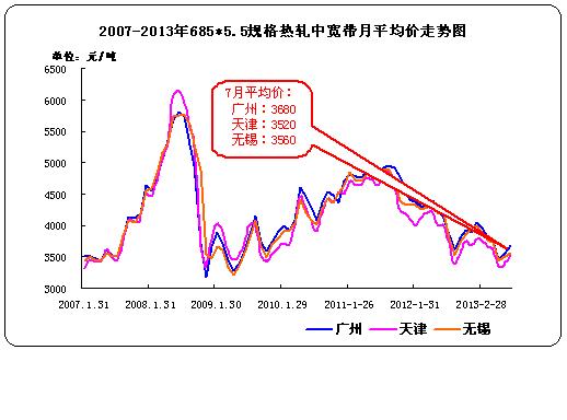 據(jù)中華商務(wù)網(wǎng)監(jiān)測(cè)數(shù)據(jù)顯示,2013年7月我國(guó)11個(gè)主要市場(chǎng)熱軋中寬帶月平均價(jià)格3586元/噸,與上月相比漲106元。其中天津、無(wú)錫、廣州四個(gè)主要市場(chǎng)7月平均價(jià)格分別為3520元/噸、3560元/噸、3680元/噸,分別較上個(gè)月漲140元/噸,漲60元/噸,漲120元/噸。