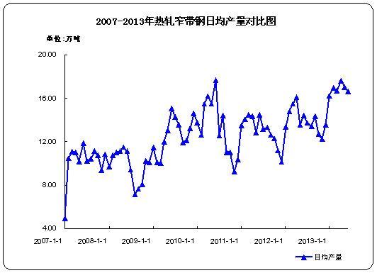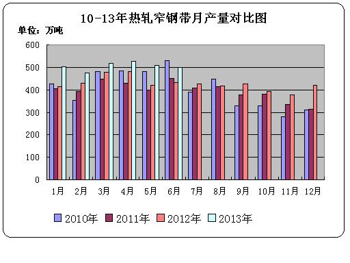 據(jù)中華商務(wù)網(wǎng)監(jiān)測(cè)數(shù)據(jù)顯示,2013年6月份國(guó)內(nèi)熱軋窄帶鋼產(chǎn)量498.8萬(wàn)噸,環(huán)比減產(chǎn)11.5萬(wàn)噸,環(huán)比減少2.25%;日均產(chǎn)量16.63萬(wàn)噸,日均環(huán)比減少2.23%;比去年同期產(chǎn)量433.3萬(wàn)噸增產(chǎn)65.5萬(wàn)噸,同比增長(zhǎng)15.12%。2013年6月份國(guó)內(nèi)冷軋窄帶鋼產(chǎn)量89.9萬(wàn)噸,環(huán)比增產(chǎn)3.1萬(wàn)噸。