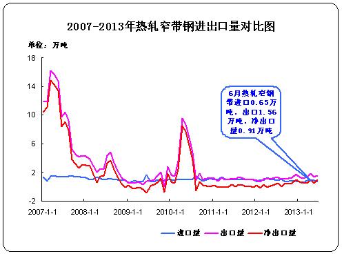 據(jù)中華商務(wù)網(wǎng)監(jiān)測(cè)數(shù)據(jù)顯示, 2013年6月份進(jìn)口熱軋窄帶鋼0.65萬(wàn)噸,出口1.56萬(wàn)噸,凈出口0.91萬(wàn)噸。6月份新增資源量497.89萬(wàn)噸。