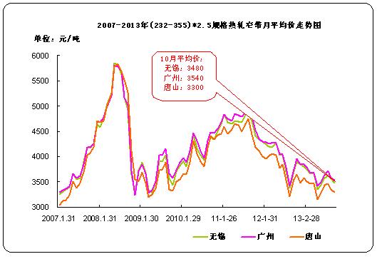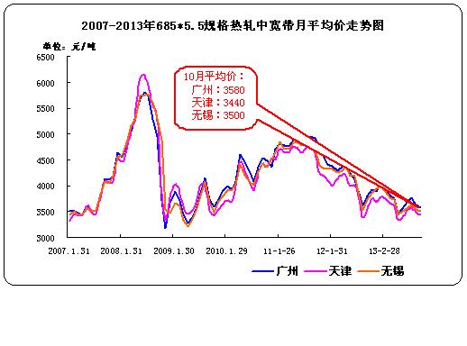 據中華商務網監(jiān)測數據顯示,2013年10月我國11個主要市場熱軋中寬帶月平均價格3505元/噸,與上月相比跌46元。其中天津、無錫、廣州四個主要市場10月平均價格分別為3440元/噸、3500元/噸、3580元/噸,分別較上個月跌40元/噸,跌50元/噸,跌50元/噸。