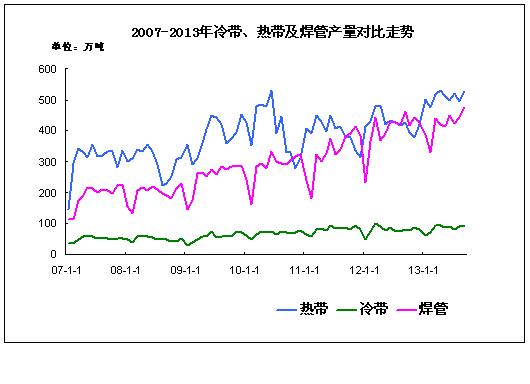 據中華商務網監(jiān)測數據顯示,2013年9月份國內熱軋窄帶鋼產量525.1萬噸,環(huán)比增加30.9萬噸,環(huán)比增長6.25%;日均產量17.5萬噸,日均環(huán)比增長9.79%;比去年同期產量428.6萬噸增產96.5萬噸,同比增長22.52%。2013年9月份國內冷軋窄帶鋼產量94.1萬噸,環(huán)比增產3.8萬噸。