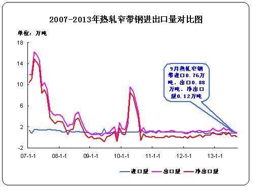 據中華商務網監(jiān)測數據顯示, 2013年9月份進口熱軋窄帶鋼0.76萬噸,出口0.88萬噸,凈出口0.12萬噸。9月份新增資源量524.98萬噸。