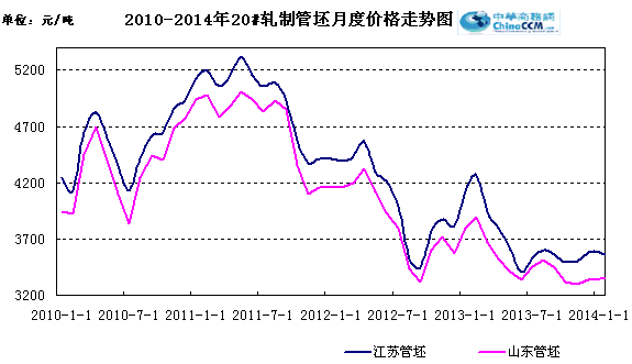 2月江蘇20#軋制管坯月均報價3526元/噸,和上月月均報價相比下調(diào)54元/噸,山東20#軋制管坯報價3340元/噸,比上月月均報價下調(diào)10元/噸。中上旬管坯價格維穩(wěn)運(yùn)行,下旬出現(xiàn)小幅走低的行情。作為冶金原料之一的鐵礦石價格下調(diào),現(xiàn)京唐港進(jìn)口的63.5%品味的印度粉礦830-840元/噸,原料價格弱勢,鋼材市場悲觀情緒更顯濃重。從其下游來看,無縫管市場價格穩(wěn)中小幅走低,市場成交處于低位,短期內(nèi)無縫管價格大幅調(diào)整的可能性不大。冶金原料價格的下行,再加上無縫管市場需求不振,短期內(nèi)管坯價格仍有繼續(xù)小跌的可能,貿(mào)易商應(yīng)謹(jǐn)慎操作。