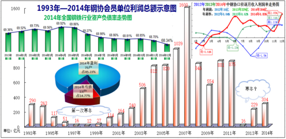 四是資產(chǎn)負(fù)債率降低。到2014年末,鋼協(xié)會員單位資產(chǎn)負(fù)債率68.34%,降至近兩年來的最好水平,較歷史最高的69.92%下降1.58個(gè)百分點(diǎn)。這顯示,全國鋼鐵業(yè)在“新常態(tài)”里,通過轉(zhuǎn)方式、調(diào)結(jié)構(gòu)、壓縮投資規(guī)模等有力措施(2014年,全國鋼鐵工業(yè)完成固定資產(chǎn)投資5250.12億元,同比下降5.42%,),取得了明顯成效。有力回?fù)袅耍?ldquo;鋼鐵業(yè)必將崩盤”等奇談怪論。