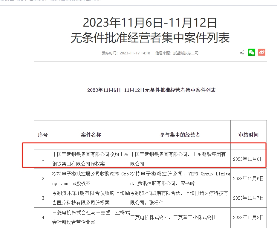 11月17日,國家市場監(jiān)督管理總局反壟斷執(zhí)法二司公布了11月6日-11月12日無條件批準經營者集中案例。其中,“中國寶武鋼鐵集團有限公司收購山東鋼鐵集團有限公司股權案”已經于11月6日辦理審結。