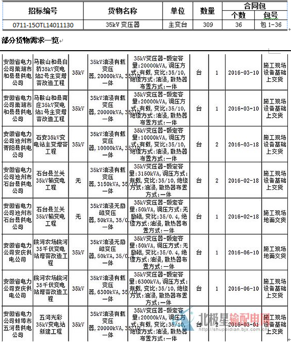 國網(wǎng)變電項目2015年(新增批次 35kV變壓器)集中招標