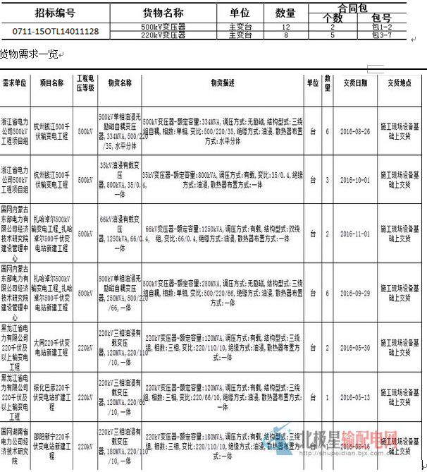 國網(wǎng)變電項目2015年(新增批次 220500kV變壓器)貨物集中招標