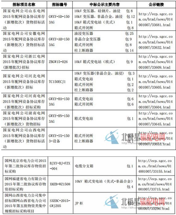 根據(jù)招標(biāo)公告及中標(biāo)人公示內(nèi)容,在國(guó)家電網(wǎng)公司2015年配網(wǎng)設(shè)備協(xié)議庫(kù)存(新增批次)貨物招標(biāo)采購(gòu)項(xiàng)目中,我公司分別在山東、安徽、浙江、河北、河南、湖南、山西等七個(gè)省(地區(qū))中標(biāo),中標(biāo)產(chǎn)品包括箱式開閉所、非晶合金變壓器、油浸式變壓器、箱式變電站、柱上斷路器等多種產(chǎn)品;在其它各省市電力公司協(xié)議庫(kù)存貨物招標(biāo)采購(gòu)項(xiàng)目中,我公司在北京、福建、山西等省網(wǎng)招標(biāo)項(xiàng)目中中標(biāo),中標(biāo)產(chǎn)品包括低壓電纜分支箱、箱式變電站、JP柜等多種產(chǎn)品。