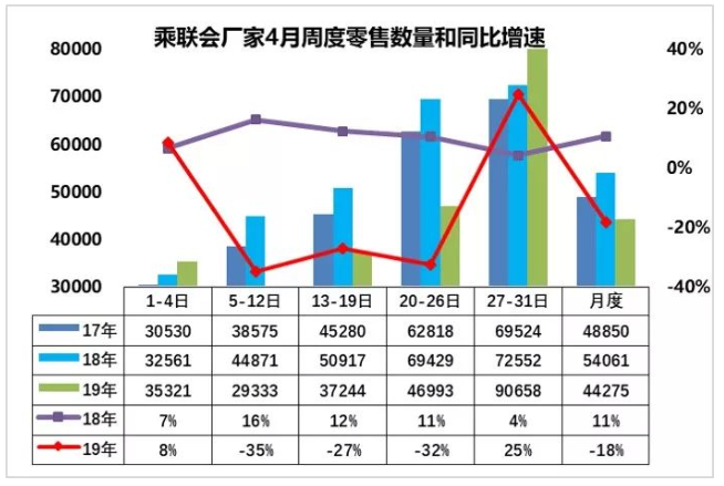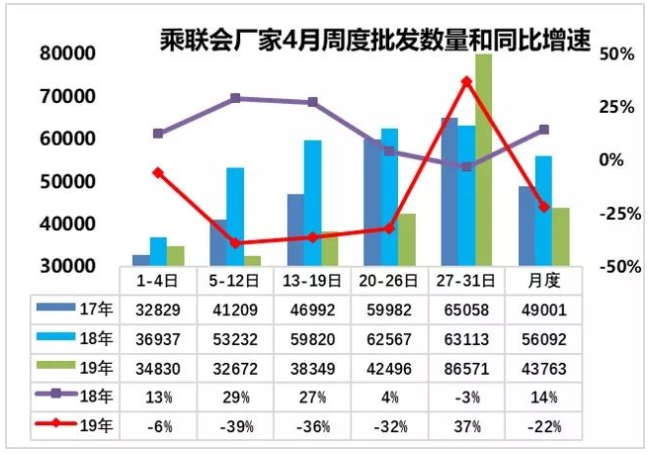 而在批發(fā)方面,4月全月總體批發(fā)量達(dá)到日均4.38萬臺,相對18年4月同期銷量下降22%,與3月的同比增速仍有一定壓力。