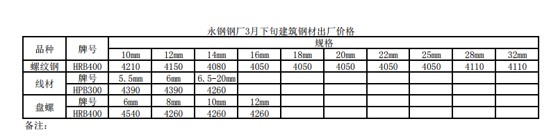 2019年永鋼鋼廠3月下旬建筑鋼材出廠價(jià)格表執(zhí)行