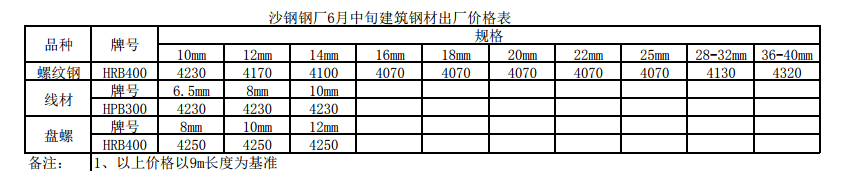 2019年沙鋼鋼廠6月中旬建筑鋼材出廠價(jià)格表執(zhí)行
