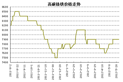 五月份整體來看,高碳鉻鐵價(jià)格走勢(shì)一改四月份下行盤整的勢(shì)頭,有所上揚(yáng)。從上月末的7600元/噸再上揚(yáng)至四月初水平7900元/噸,上升幅度300元/噸。高碳鉻鐵的價(jià)格抬升不屬于意外現(xiàn)象,這和前期多數(shù)生產(chǎn)廠家有意調(diào)節(jié)不無關(guān)系。
