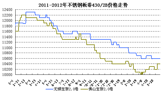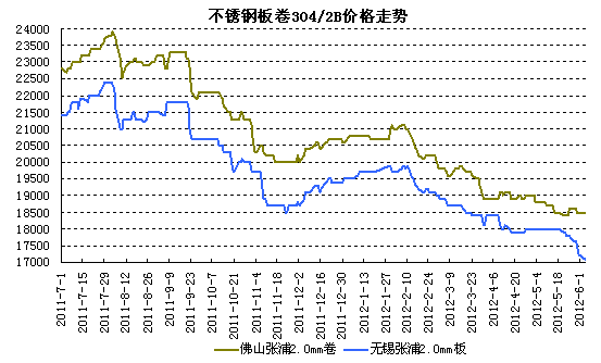 國(guó)內(nèi)300系不銹鋼價(jià)格五月總體處于向下盤整的態(tài)勢(shì)。由于受原材料期鎳價(jià)格的影響,部分地區(qū)下跌幅度較大。無錫市場(chǎng)張浦304/2B平板價(jià)格從月初18000元/噸到月末17100元/噸,累積走跌900元/噸。佛山市場(chǎng)上張浦304/2B冷軋卷板從月初18800元/噸至18500元/噸,總體出現(xiàn)500元/噸跌幅。由此可見,本月300系不銹鋼產(chǎn)品普遍走低,跌幅較大。