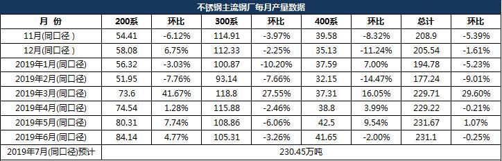 2019年6月份主流21家鋼廠同口徑不銹鋼粗鋼產(chǎn)量總量為231.1萬噸,環(huán)比5月微幅減少0.25%。分系別來看,200系產(chǎn)量84.14萬噸,環(huán)比增加4.77%,主要因誠德300系產(chǎn)量轉(zhuǎn)200系,200系產(chǎn)量環(huán)比增4萬噸左右,其余鋼廠有增有減,總體變化不大;300系產(chǎn)量105.31萬噸,環(huán)比減少3.26%,主要因北海誠德部分300系量轉(zhuǎn)200系,太鋼和張浦300系也有小幅減少,其余廠家環(huán)比變化不大;400系41.65萬噸,環(huán)比減少2.00%,主要是青山和酒鋼400系產(chǎn)量環(huán)比減少。2019年7月份同口徑預(yù)計總產(chǎn)量230.45萬噸,200系82.48萬噸,300系108.65萬噸,400系39.52萬噸,7月繼續(xù)維持高排產(chǎn)。