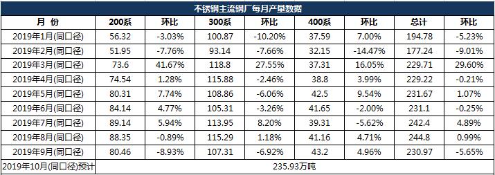 2019年9月份主流21家鋼廠同口徑不銹鋼粗鋼產(chǎn)量總量為230.97萬噸,環(huán)比8月減少5.73%。分系別來看,200系產(chǎn)量80.46萬噸,環(huán)比減少8.93%,主要因華樂、金匯、青拓減產(chǎn);300系產(chǎn)量107.31萬噸,環(huán)比減少6.92%,主要因太鋼產(chǎn)量大減,減少約6萬噸;400系43.2萬噸,環(huán)比增加4.96%,主要是鞍鋼聯(lián)眾產(chǎn)量增加,增加400系約2萬噸,其余鋼廠各有增減。2019年10月份同口徑預(yù)計(jì)總產(chǎn)量235.93萬噸,200系73.1萬噸,300系118.32萬噸,400系44.34萬噸,,10月產(chǎn)量略有增加,繼續(xù)維持高排產(chǎn)。
