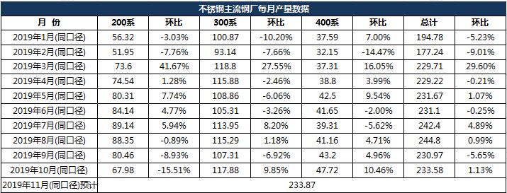 2019年10月份主流21家鋼廠同口徑不銹鋼粗鋼產(chǎn)量總量為233.58萬(wàn)噸,環(huán)比9月增加1.13%。分系別來(lái)看,200系產(chǎn)量67.98萬(wàn)噸,環(huán)比減少15.51%,主要因華樂(lè)、聯(lián)眾、青山系減產(chǎn);300系產(chǎn)量117.88萬(wàn)噸,環(huán)比增加9.85%,主要因青山系產(chǎn)量大增,增加約8萬(wàn)噸;400系47.72萬(wàn)噸,環(huán)比增加10.46%,主要是太鋼集團(tuán)產(chǎn)量增加,增加400系約3萬(wàn)噸,其余鋼廠各有增減。2019年11月份同口徑預(yù)計(jì)總產(chǎn)量232.87萬(wàn)噸,200系72.55萬(wàn)噸,300系116.86萬(wàn)噸,400系44.46萬(wàn)噸,預(yù)計(jì)11月產(chǎn)量基本不變,繼續(xù)維持高排產(chǎn)。