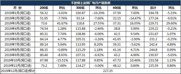2019年11月份主流21家鋼廠同口徑不銹鋼粗鋼產(chǎn)量總量為235.59萬噸,環(huán)比10月增加0.86%。分系別來看,200系產(chǎn)量73.2萬噸,環(huán)比增加7.68%,主要因華樂合金復(fù)產(chǎn),增加5.5萬噸,青山、聯(lián)眾各有增減;300系產(chǎn)量114.27萬噸,環(huán)比減少3.06%,主要因青山系減少約4萬噸;400系48.12萬噸,環(huán)比增加0.84%,整體變化不大,太鋼增加1.34萬噸,泰山因檢修減少0.7萬噸。2019年12月份同口徑預(yù)計(jì)總產(chǎn)量227.35萬噸,200系75.05萬噸,300系106.02萬噸,400系46.28萬噸,預(yù)計(jì)12月產(chǎn)量有所減少,因德龍減產(chǎn)約1/3。