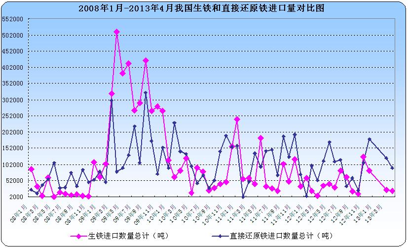 圖12、2008年1月-13年4月我國進(jìn)口生鐵、直接還原鐵數(shù)量走勢圖(噸):