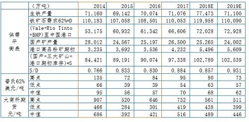 由于中低品礦、高品礦及廢鋼用量在2017-2018年根據(jù)利潤進(jìn)行了調(diào)整,導(dǎo)致生鐵產(chǎn)量和鐵礦石需求間背離,而期貨價(jià)格和62%的礦石相關(guān)性較高,因此本表通過高品粉礦的供需情況來預(yù)測期貨價(jià)格。在通過歷史數(shù)據(jù)判斷價(jià)格時(shí),根據(jù)利潤情況將2014-2016年和2017-2019年分為兩個(gè)階段,此處的假設(shè)為2019年螺紋利潤在300-600元/噸。通過2017-2018年高品礦供需情況的對(duì)比,預(yù)測2019年鐵礦石期貨價(jià)格的中值為446元,同比下跌8.7%,高點(diǎn)和低點(diǎn)分別為399元/噸和511元/噸。