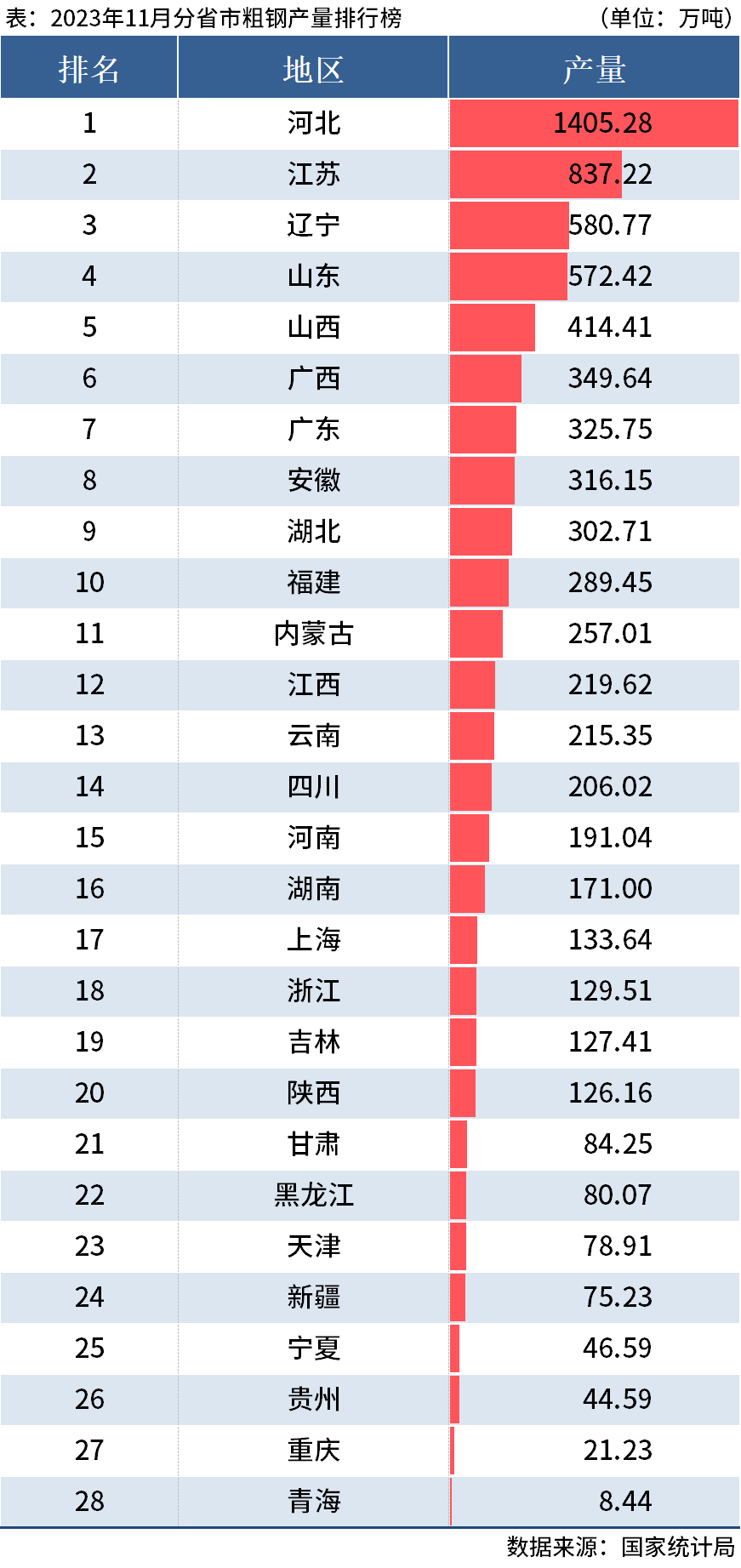 國(guó)家統(tǒng)計(jì)局?jǐn)?shù)據(jù)顯示,2023年11月中國(guó)粗鋼產(chǎn)量7609.9萬(wàn)噸,同比增長(zhǎng)0.4%;1-11月中國(guó)粗鋼產(chǎn)95214.0萬(wàn)噸,同比增長(zhǎng)1.5%。其中,產(chǎn)量排名前二的省份分別是河北和江蘇。具體情況如下: