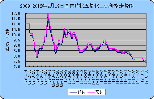 以下為2009-2012年4月19日國內片狀五氧化二釩價格走勢圖: