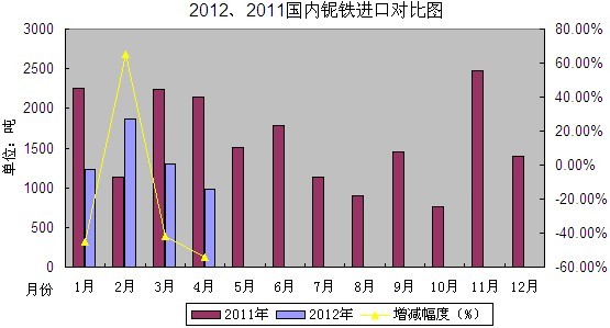• 據(jù)海關數(shù)據(jù)顯示:2012年4月份國內鈮鐵進口量繼續(xù)下滑