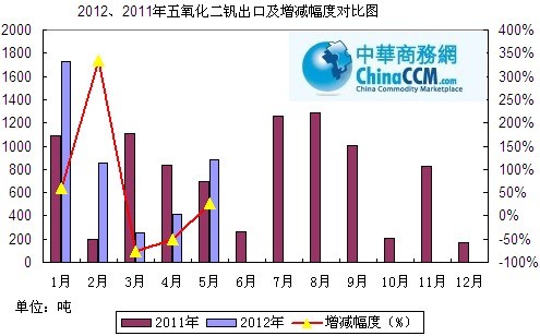 • 海關(guān)數(shù)據(jù)顯示:2012年5月國內(nèi)五氧化二釩出口