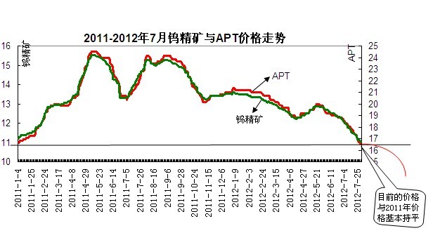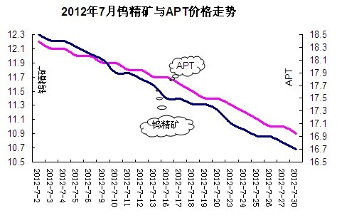 六月低鎢礦的價(jià)格已看到了12萬(wàn),七月初,五礦黑鎢標(biāo)礦報(bào)價(jià)12.3萬(wàn),與六月的13萬(wàn)相比,降幅5.38%,贛州鎢協(xié)七月的指導(dǎo)價(jià),黑鎢標(biāo)礦為12.3萬(wàn),APT與鎢粉分別為18.8萬(wàn),296元。五礦的報(bào)價(jià)如六月的報(bào)價(jià)一樣,并未給市場(chǎng)一種止穩(wěn)信號(hào),伴隨資金緊張,供求失衡,整體鎢價(jià)仍在不斷跳水,當(dāng)鎢礦價(jià)格滑下12萬(wàn),直逼11萬(wàn)時(shí),市場(chǎng)仍沒有停滯,到月底,標(biāo)礦的價(jià)格已經(jīng)看到10.8萬(wàn)了。市場(chǎng)恐慌嗎,沒看到,只是有更多的人預(yù)測(cè)10萬(wàn)也許是鎢礦的底部。