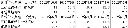 在一陣質(zhì)疑聲中,礦價在本年第二次逆市而起,礦山企業(yè)的惜售,看漲心態(tài)尤為突出,報價不斷高出,雖然冶煉廠一再質(zhì)疑高價,但是低價拿礦異常困難,(好像四月中旬的漲價也是這種原因。)10.5萬的60度左右的鎢礦在十月中偶有成交,到月末的時候55度的鎢礦的價格在10.8萬以上,甚至有工廠在11萬的價位成交了50度的鎢礦。礦價,貨緊,價翹,礦山企業(yè)認(rèn)為,四季度的產(chǎn)量將要減少,手中的囤貨不多,而貿(mào)易商手中的鎢礦量也不多,冶煉廠的采購很弱,鎢礦更是不多,價格沒有不漲的道理。但冶煉企業(yè)卻由于后端的訂單不見放量而采購鎢礦而遲緩,等等看的心態(tài)一再突出。