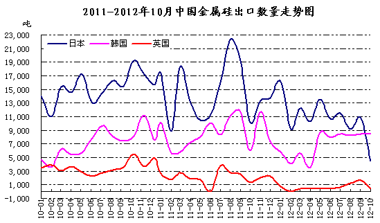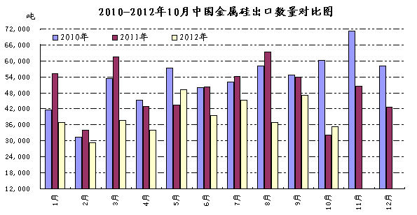 據(jù)2012年海關數(shù)據(jù)顯示,出口量在4萬噸以上的月份屈指可數(shù),僅5月、7月、9月出口量在4萬噸以上,除2月份新年金屬硅出口量稀少外,剩余月份出口在3.5萬噸上下,2011年全年出口量在58萬噸,截止發(fā)稿時,今年1-10月出口約在39.2萬噸,出口需求下滑一方面受國際經(jīng)濟前景不樂觀影響,然而下游多晶硅等行業(yè)受歐美反傾銷影響價格不斷下滑,因此對金屬硅采購能力下降,導致出口量減少,隨后發(fā)生的釣魚島事件,雖不及日本地震時的影響那么大,但中國出口商對日本出口數(shù)量也在當月及隨后的一個月內(nèi)反應出來。第二方面則是出口走私也對正常市場造成一定沖擊,這也是造成出口數(shù)量下滑的影響因素之一。