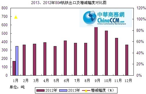 最新海關(guān)數(shù)據(jù)顯示:2013年1月國內(nèi)五氧化二釩出口815.408噸,環(huán)比去年12月360.53噸大幅增長126.2%;釩鐵出口346.325噸,環(huán)比去年12月363.3噸小幅減少4.7%;釩氮合金出口30噸,去年12月為28.15噸。進(jìn)口方面,1月五氧化二釩進(jìn)口0.2噸,釩鐵仍無進(jìn)口;釩氮合金進(jìn)口114.015噸,去年12月為57.008噸。