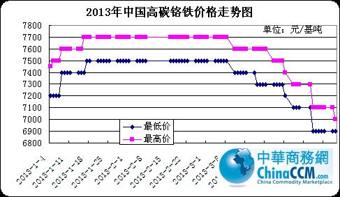 在經(jīng)歷了兩個月的價格上揚(yáng)持穩(wěn)后,3月下旬受鋼廠招標(biāo)價打壓,國內(nèi)高碳鉻鐵現(xiàn)貨售價再次下跌,時至今日廠家報價已降至6900元/基噸水平,不過鋼廠仍然以低價試探,上周張浦6850元/基噸詢價讓市場再起“爭議”。
