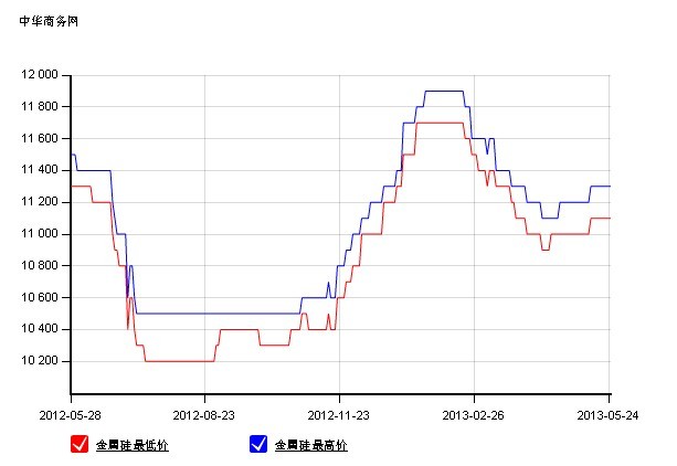 上圖為四川地區(qū)近一年走勢(shì),2012年5月末市場(chǎng)主流價(jià)在11300-11500元/噸,而截至2013年5月27日,市場(chǎng)主流參考價(jià)在11200-11300元/噸,目前市場(chǎng)需求也沒有明顯恢復(fù),6月市場(chǎng)開工上升后,價(jià)格或出現(xiàn)100-200元/噸左右的回落空間。