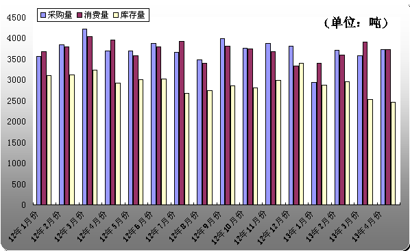 下圖為2012年1月-2013年4月日本鋁合金行情對于金屬硅的進口、消費和庫存量統(tǒng)計圖: