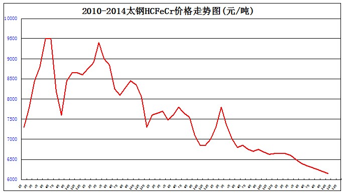 最近的一次企穩(wěn)回升出現(xiàn)在2013年12月,安慰性漲價20元至6650元,時間僅短暫的一個月,并未激起市場回升的漣漪。進入2014年以后,中國鉻鐵生產(chǎn)者基于過往年份的經(jīng)驗,樂觀者或預(yù)期回升,謹慎者或心存祈禱。鉻鐵價格猶如峨眉山的下山之路,傾瀉而下,并無停頓,也無蜿蜒,50元或100元的跌落成為了降價的基本節(jié)奏。