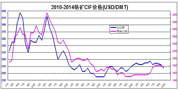 理性人士都清楚,2013年盛極一時的小粒、粗粉、原礦等礦種已經(jīng)難覓蹤影,由此不難判斷出鉻礦價格已經(jīng)跌無可跌的客觀情形。土耳其等地的高品位塊礦,從2013春季開始已經(jīng)出現(xiàn)了3輪回升性行情。隨著中國鉻鐵生產(chǎn)為降低礦石成本而轉(zhuǎn)換采用的燒結(jié)工藝在全國范圍內(nèi)普及,曾經(jīng)誤以為取之不盡的南非粉礦也在2014年開始了成本性價格回歸,短短兩個月內(nèi)上漲30美元/DMT,漲幅達到20%。